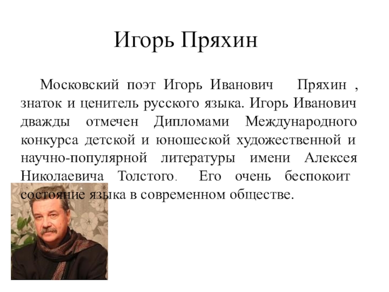 русского языка. Игорь Иванович дважды отмечен Дипломами Международного конкурса детской и юношеской художественной и научно-популярной литературы имени Алексея Николаевича Толстого. Его очень беспокоит состояние языка в современном обществе.