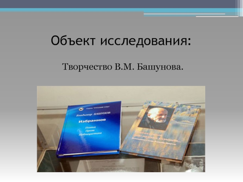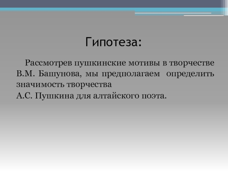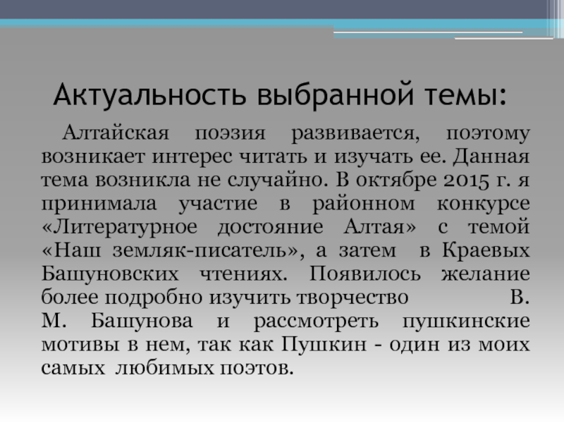 изучать ее. Данная тема возникла не случайно. В октябре 2015 г. я принимала участие в районном конкурсе «Литературное достояние Алтая» с темой «Наш земляк-писатель», а затем в Краевых Башуновских чтениях. Появилось желание более подробно изучить творчество В.М. Башунова и рассмотреть пушкинские мотивы в нем, так как Пушкин - один из моих самых любимых поэтов.