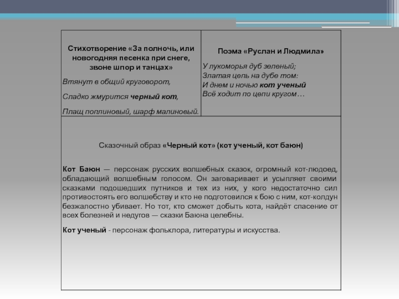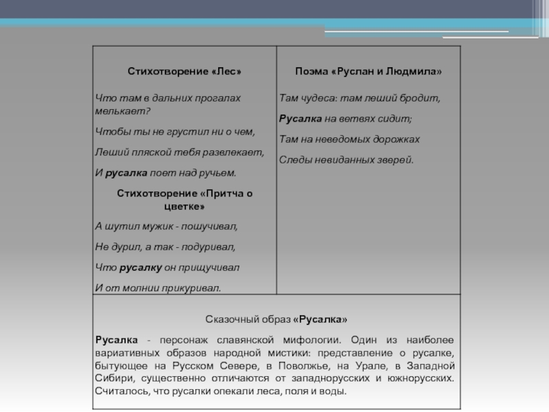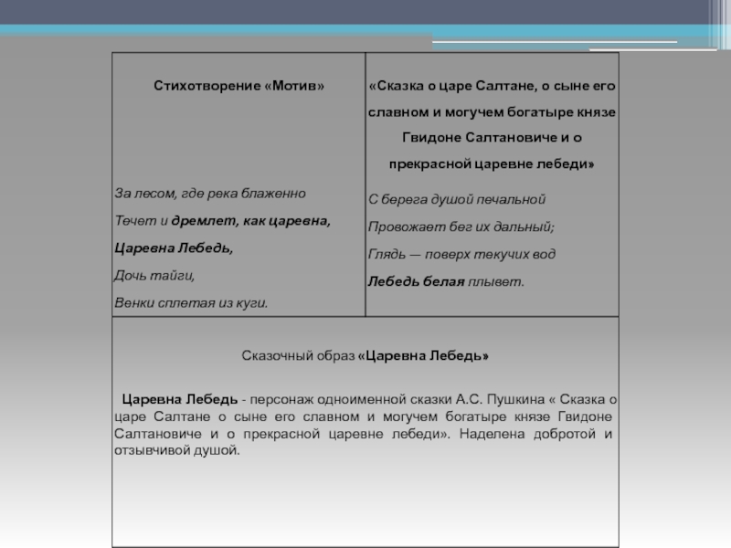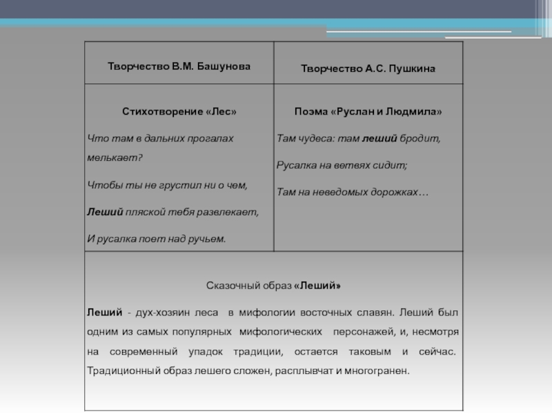 Огромное значение для алтайского поэта имели сказочные образы из пролога к поэме А.С. Пушкина «Руслан и Людмила», так как именно это произведение «познакомило» маленького Володю с великим русским писателем. В.М. Башунов не имел цели специально использовать их в своих произведениях. И Кот, и Леший, и Русалка, и Царевна Лебедь возникали сами собой. Они всегда были в сознании писателя и просто ждали своего часа.