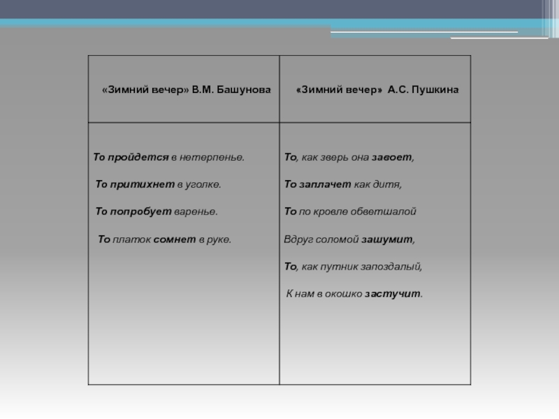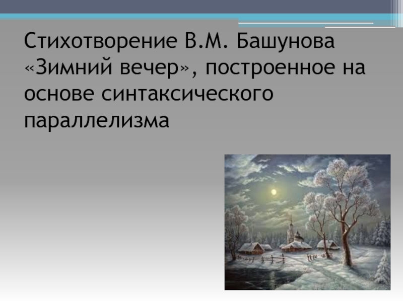 Слайд 25Стихотворение В.М. Башунова «Зимний вечер», построенное на основе синтаксического параллелизма