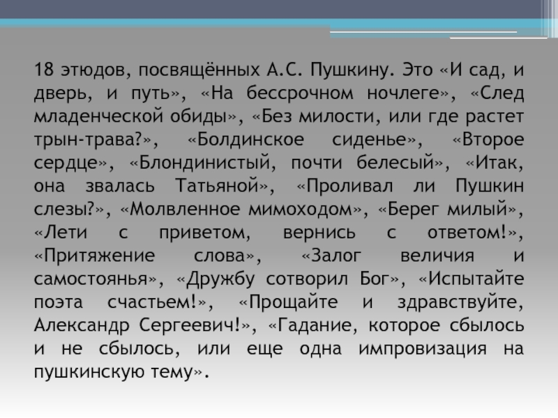 18 этюдов, посвящённых А.С. Пушкину. Это «И сад, и дверь, и