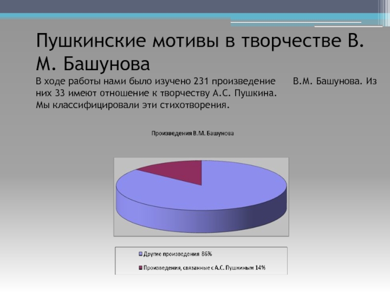 лирику В.М. Башунова и определили его отношение к А.С. Пушкину. Рассмотрели 231 произведение и выявили пушкинские мотивы в 33 из них. Эти стихотворения классифицировали. Исходя из полученных данных, выяснилось, что В.М. Башунов в своих стихотворениях неоднократно использовал пушкинские образы, которые органично вошли в его поэзию и стали «мостиком» между 19 и 20 веком.
