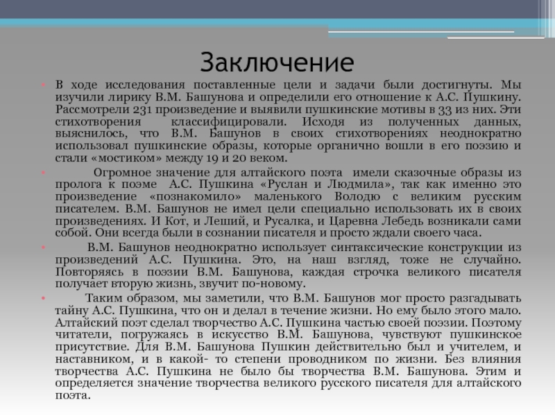 Таким образом, мы заметили, что В.М. Башунов мог просто разгадывать тайну А.С. Пушкина, что он и делал в течение жизни. Но ему было этого мало. Алтайский поэт сделал творчество А.С. Пушкина частью своей поэзии. Поэтому читатели, погружаясь в искусство В.М. Башунова, чувствуют пушкинское присутствие. Для В.М. Башунова Пушкин действительно был и учителем, и наставником, и в какой- то степени проводником по жизни. Без влияния творчества А.С. Пушкина не было бы творчества В.М. Башунова. Этим и определяется значение творчества великого русского писателя для алтайского поэта.