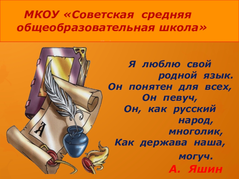 МКОУ «Советская средняя общеобразовательная школа»Я люблю свой родной язык.Он понятен для всех,Он певуч,Он, как русский народ, многолик,Как держава наша, могуч.