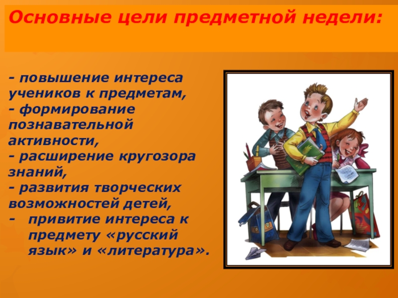 Основные цели предметной недели: - повышение интереса учеников к предметам,- формирование познавательной активности,- расширение кругозора знаний,- развития