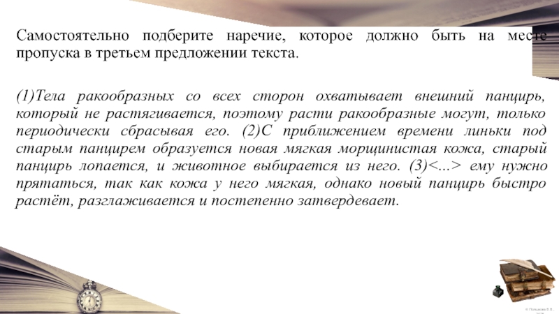 (1)Тела ракообразных со всех сторон охватывает внешний панцирь, который не растягивается, поэтому расти ракообразные могут, только периодически сбрасывая его. (2)С приближением времени линьки под старым панцирем образуется новая мягкая морщинистая кожа, старый панцирь лопается, и животное выбирается из него. (3)<...> ему нужно прятаться, так как кожа у него мягкая, однако новый панцирь быстро растёт, разглаживается и постепенно затвердевает.