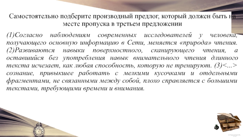 Слайд 3Самостоятельно подберите производный предлог, который должен быть на месте пропуска в