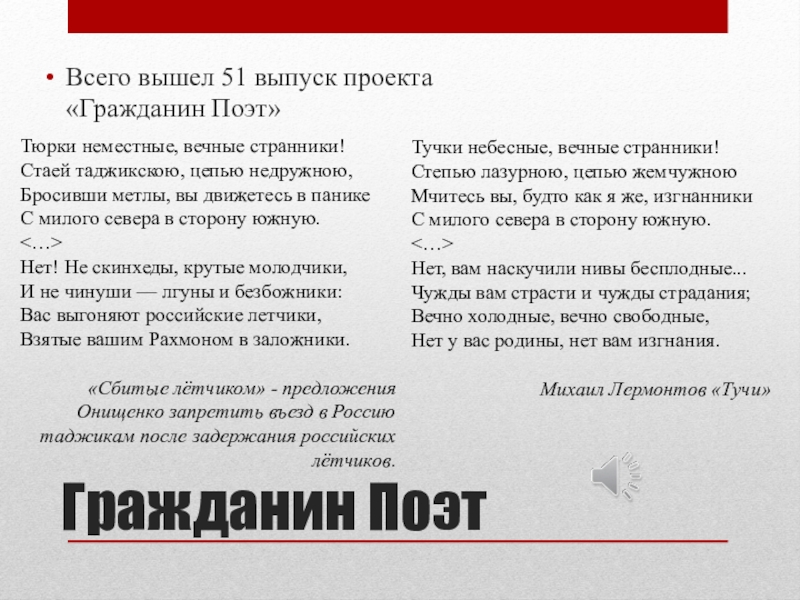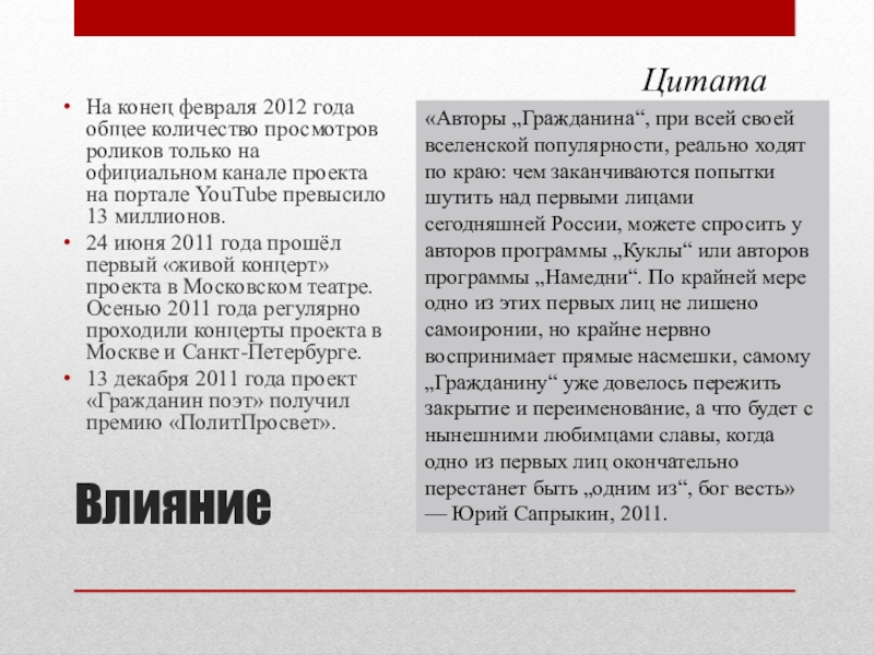 «Авторы „Гражданина“, при всей своей вселенской популярности, реально ходят по краю: чем заканчиваются попытки шутить над первыми лицами сегодняшней России, можете спросить у авторов программы „Куклы“ или авторов программы „Намедни“. По крайней мере одно из этих первых лиц не лишено самоиронии, но крайне нервно воспринимает прямые насмешки, самому „Гражданину“ уже довелось пережить закрытие и переименование, а что будет с нынешними любимцами славы, когда одно из первых лиц окончательно перестанет быть „одним из“, бог весть» — Юрий Сапрыкин, 2011.