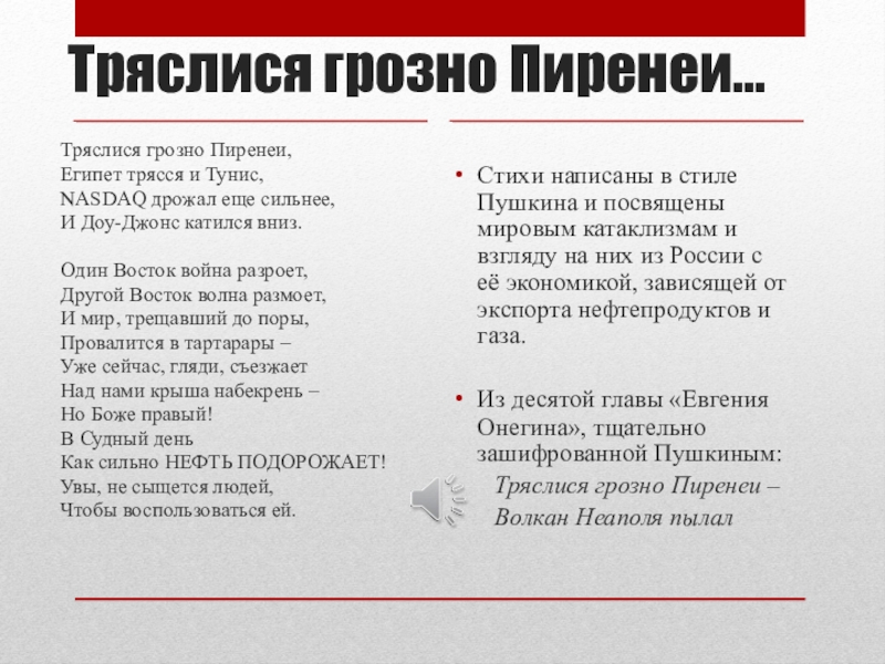 Стихи написаны в стиле Пушкина и посвящены мировым катаклизмам и взгляду на них из России с её экономикой, зависящей от экспорта нефтепродуктов и газа.