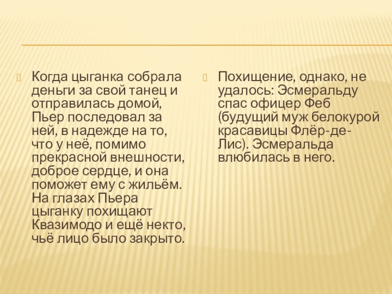 Похищение, однако, не удалось: Эсмеральду спас офицер Феб (будущий муж белокурой красавицы Флёр-де-Лис). Эсмеральда влюбилась в него.