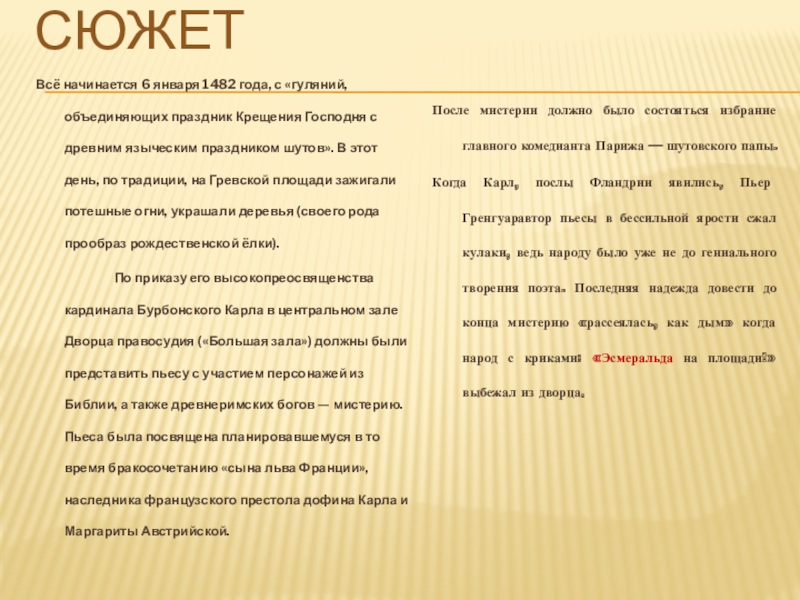Когда Карл, послы Фландрии явились, Пьер Гренгуаравтор пьесы в бессильной ярости сжал кулаки, ведь народу было уже не до гениального творения поэта. Последняя надежда довести до конца мистерию «рассеялась, как дым» когда народ с криками: «Эсмеральда на площади!» выбежал из дворца.