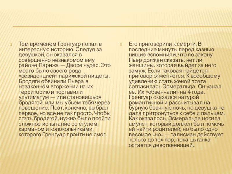 Его приговорили к смерти. В последние минуты перед казнью нищие вспомнили, что по закону Пьер должен сказать, нет ли женщины, которая выйдет за него замуж. Если таковая найдётся — приговор отменяется. К всеобщему удивлению стать женой поэта согласилась Эсмеральда. Он узнал её. Их «обвенчали» на 4 года. Гренгуар оказался натурой романтичной и рассчитывал на бурную брачную ночь, но девушка не дала притронуться к себе и пальцем. Как оказалось, Эсмеральда носила амулет, который должен был помочь ей найти родителей, но было одно весомое «но» — талисман действует только до тех пор, пока цыганка остается девственницей.