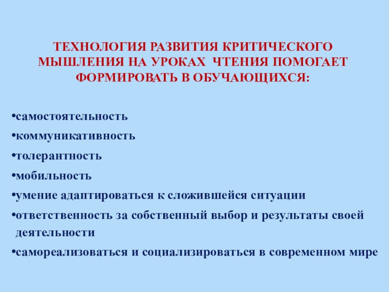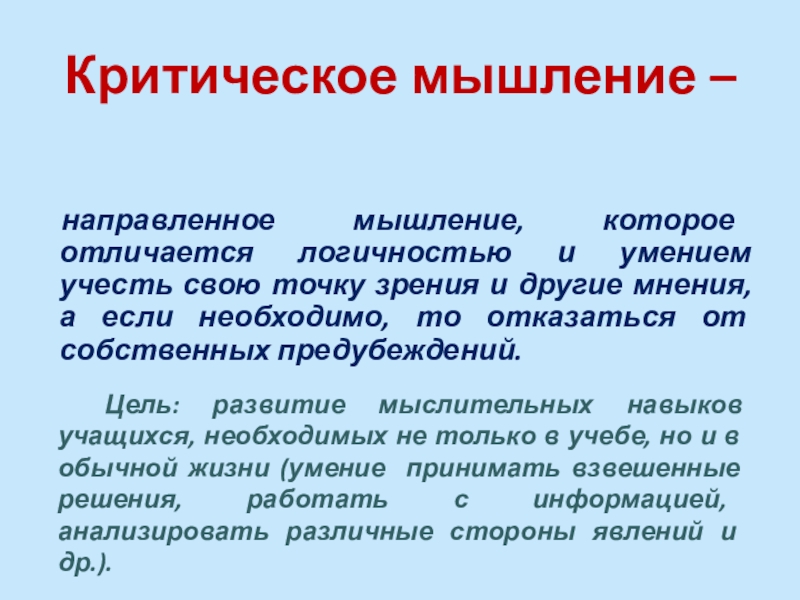 Цель: развитие мыслительных навыков учащихся, необходимых не только в учебе, но и в обычной жизни (умение принимать взвешенные решения, работать с информацией, анализировать различные стороны явлений и др.).