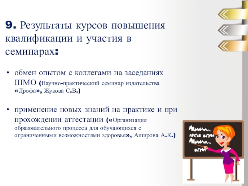 Слайд 499. Результаты курсов повышения квалификации и участия в семинарах: