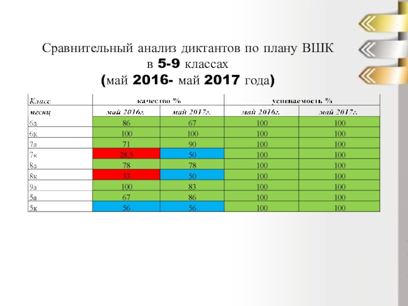 Слайд 24Сравнительный анализ диктантов по плану ВШК в 5-9 классах