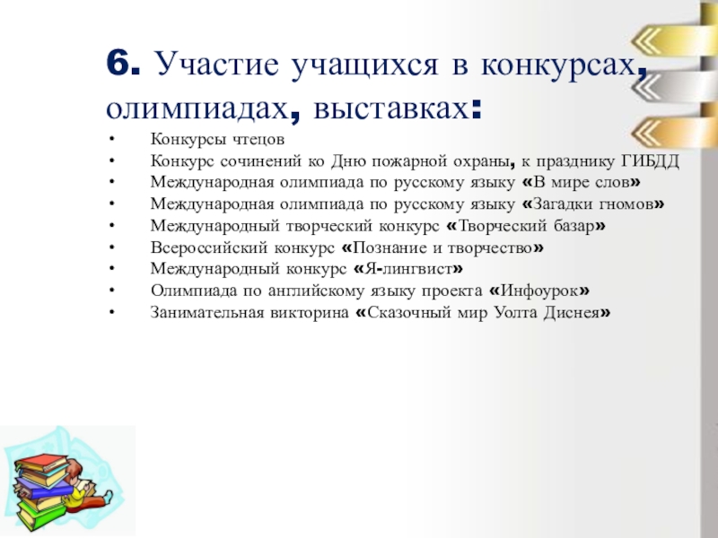 Слайд 346. Участие учащихся в конкурсах, олимпиадах, выставках: