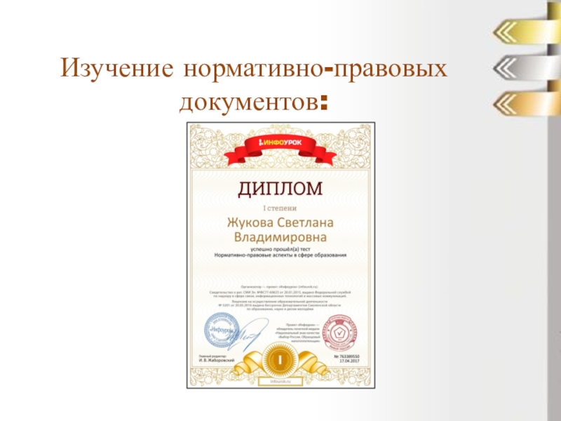 тестирование на сайте «Инфоурок.ру» по теме «Нормативно-правовые аспекты в сфере образования»