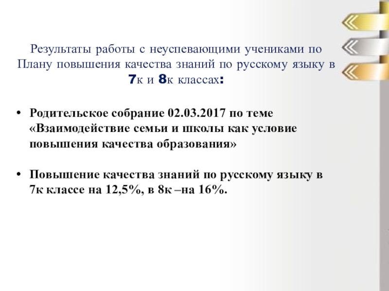 Слайд 15Результаты работы с неуспевающими учениками по Плану повышения качества знаний по