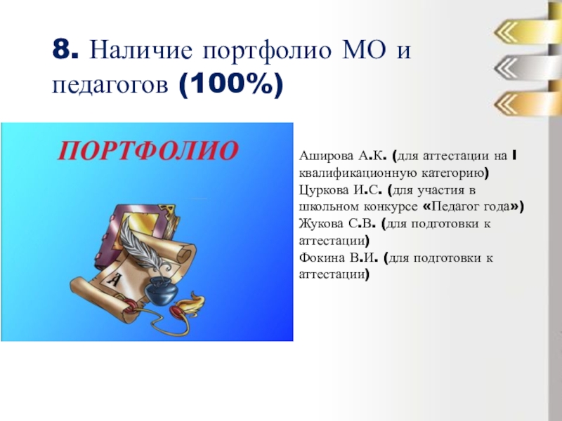 Слайд 488. Наличие портфолио МО и педагогов (100%)