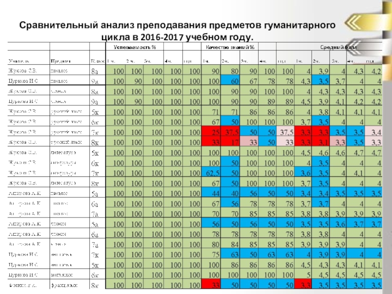 Слайд 29Сравнительный анализ преподавания предметов гуманитарного цикла в 2016-2017 учебном году.