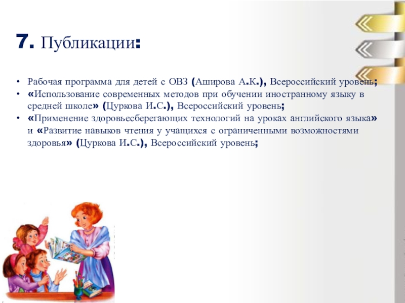 «Применение здоровьесберегающих технологий на уроках английского языка» и «Развитие навыков чтения у учащихся с ограниченными возможностями здоровья» (Цуркова И.С.), Всероссийский уровень;