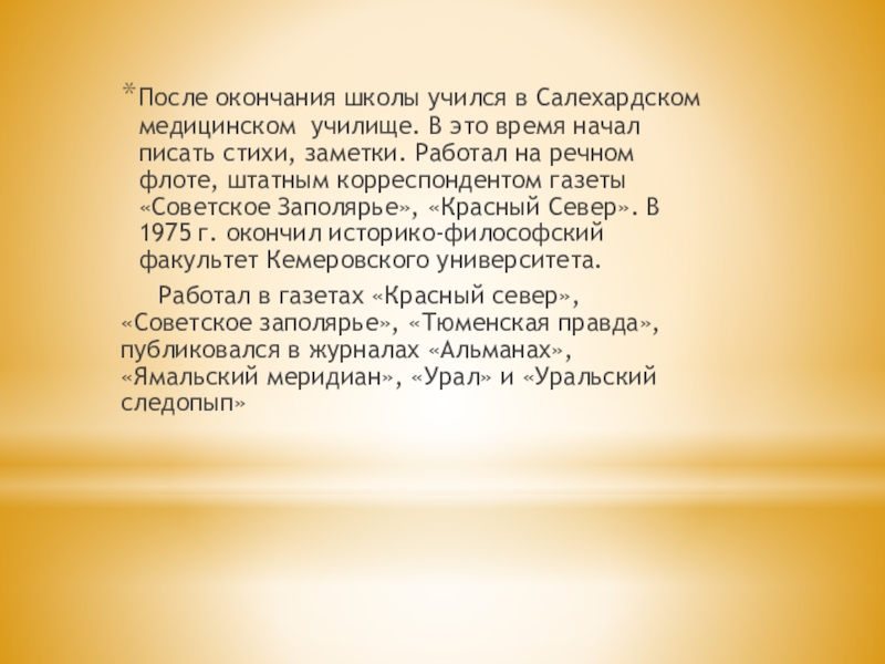 Слайд 4После окончания школы учился в Салехардском медицинском училище. В это время