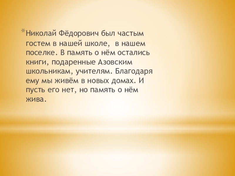 Николай Фёдорович был частым гостем в нашей школе, в нашем поселке. В память о нём остались книги,
