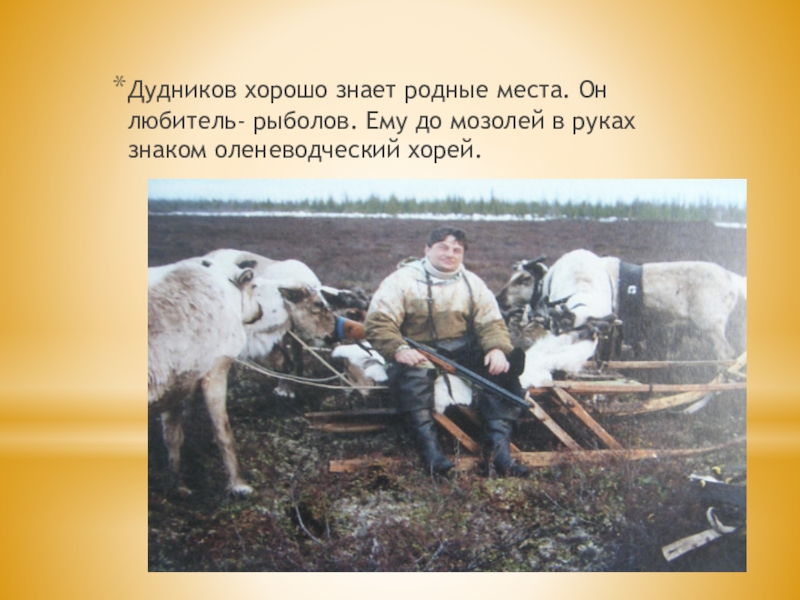 Дудников хорошо знает родные места. Он любитель- рыболов. Ему до мозолей в руках знаком оленеводческий хорей.