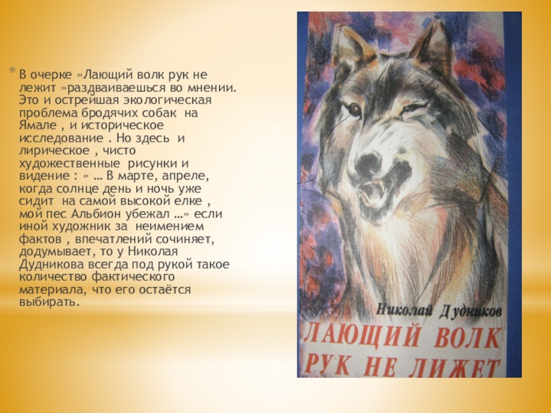 Слайд 9В очерке «Лающий волк рук не лежит »раздваиваешься во мнении. Это