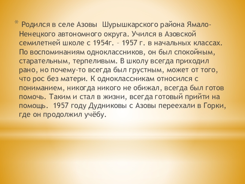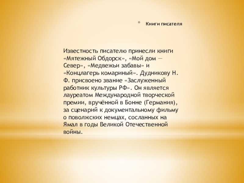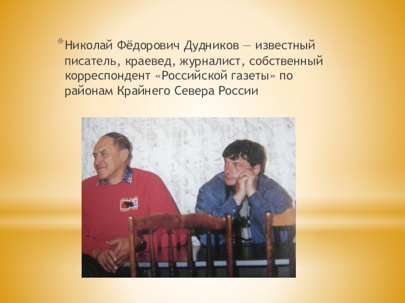 Презентация, доклад о жизни и творчестве известного ямальского журналиста, писателя Дудникова Н.Ф
