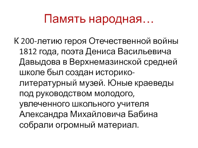 Васильевича Давыдова в Верхнемазинской средней школе был создан историко-литературный музей. Юные краеведы под руководством молодого, увлеченного школьного учителя Александра Михайловича Бабина собрали огромный материал.