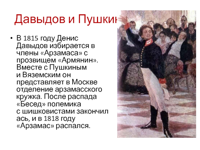 В 1815 году Денис Давыдов избирается в члены «Арзамаса» с прозвищем «Армянин».