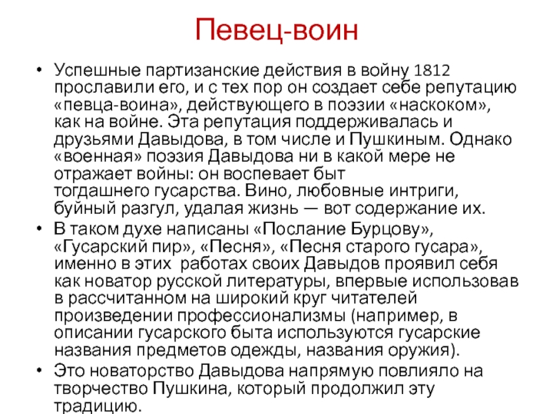 пор он создает себе репутацию «певца-воина», действующего в поэзии «наскоком», как на войне. Эта репутация поддерживалась и друзьями Давыдова, в том числе и Пушкиным. Однако «военная» поэзия Давыдова ни в какой мере не отражает войны: он воспевает быт тогдашнего гусарства. Вино, любовные интриги, буйный разгул, удалая жизнь — вот содержание их.