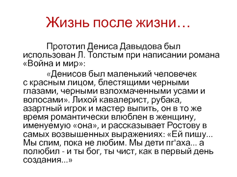 Дениса Давыдова был использован Л. Толстым при написании романа «Война и мир»:
