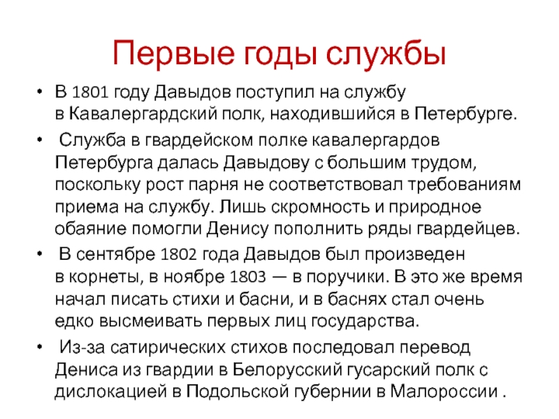 Служба в гвардейском полке кавалергардов Петербурга далась Давыдову с большим трудом, поскольку рост парня не соответствовал требованиям приема на службу. Лишь скромность и природное обаяние помогли Денису пополнить ряды гвардейцев.