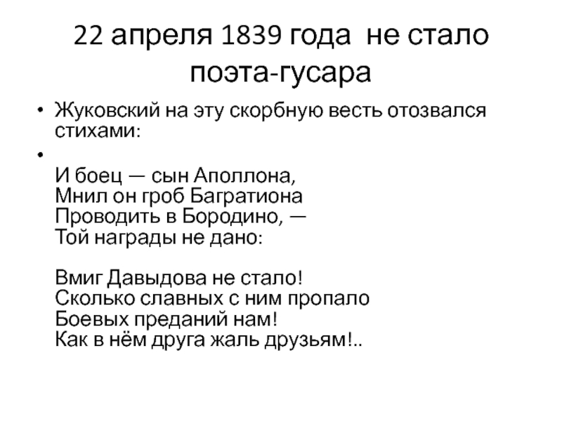Слайд 2322 апреля 1839 года не стало поэта-гусара