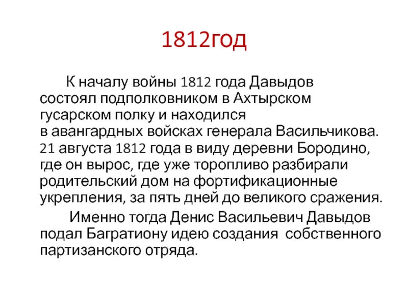 К началу войны 1812 года Давыдов состоял подполковником