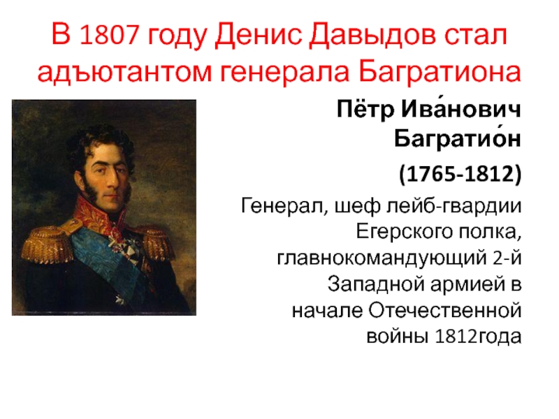 Слайд 8В 1807 году Денис Давыдов стал адъютантом генерала Багратиона