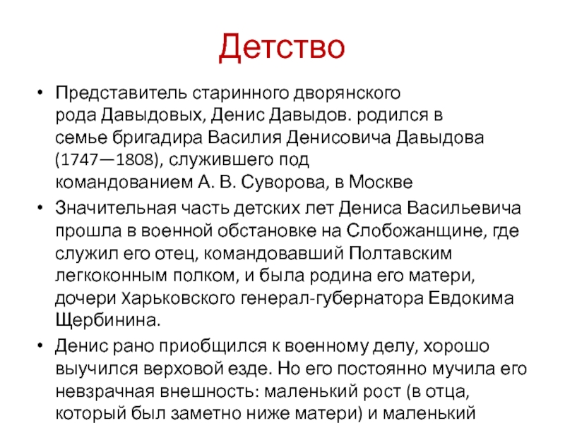 Представитель старинного дворянского рода Давыдовых, Денис Давыдов. родился в семье бригадира Василия Денисовича Давыдова