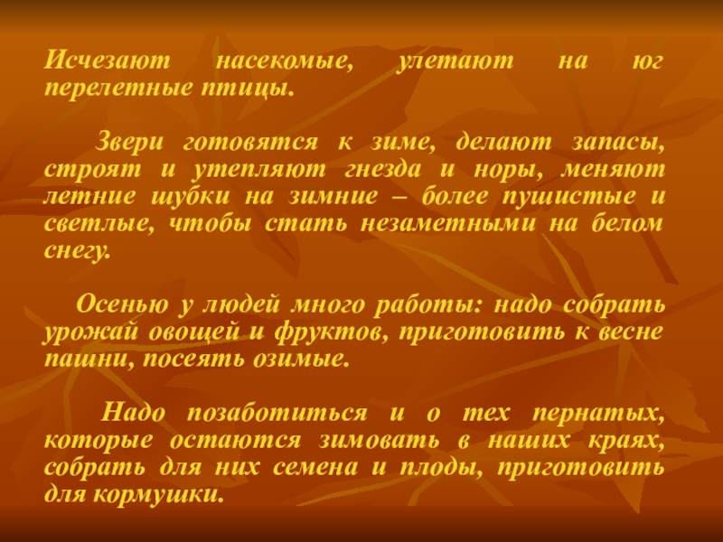 Осенью у людей много работы: надо собрать урожай овощей и фруктов, приготовить к весне пашни, посеять озимые.