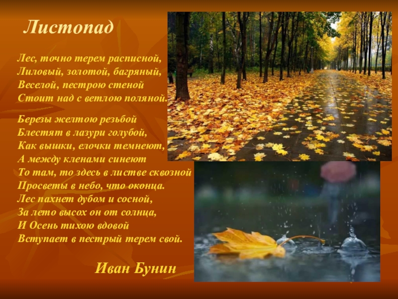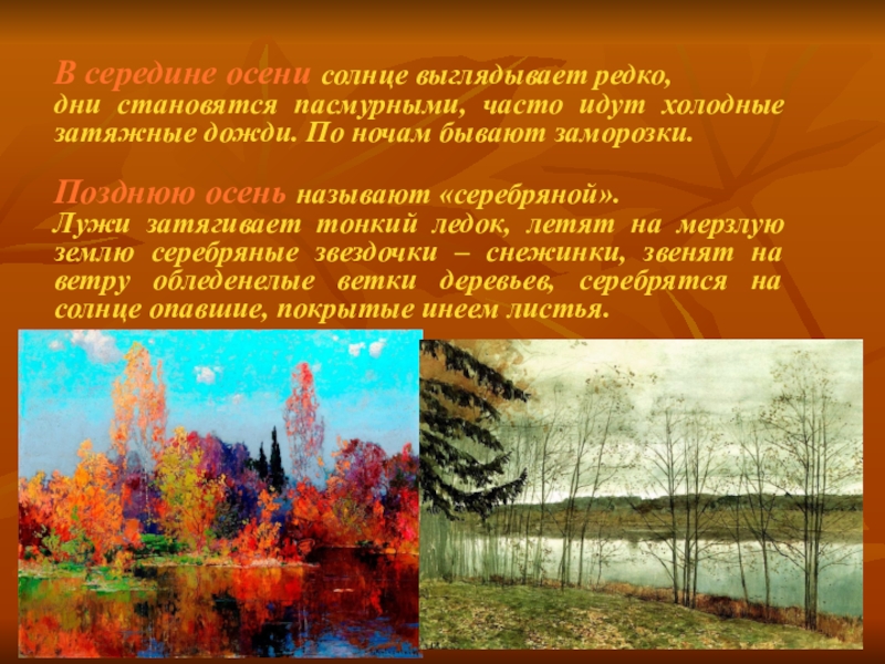и кустарниках. Воздух прохладный, прозрачный и в нем летают серебряные нити паутины. Стоят погожие солнечные деньки короткого «Бабьего лета». Но солнце уже поднимается высоко, дни становятся короче, а ночи длиннее. Моросят мелкие холодные дожди, по утрам стелются туманы. Порывы ветра срывают с деревьев желтые, багряные и лиловые листья, которые устилают землю пестрым ковром. Начинается пора листопада. Деревья постепенно теряют свой пышный яркий убор, ветви их обнажаются.