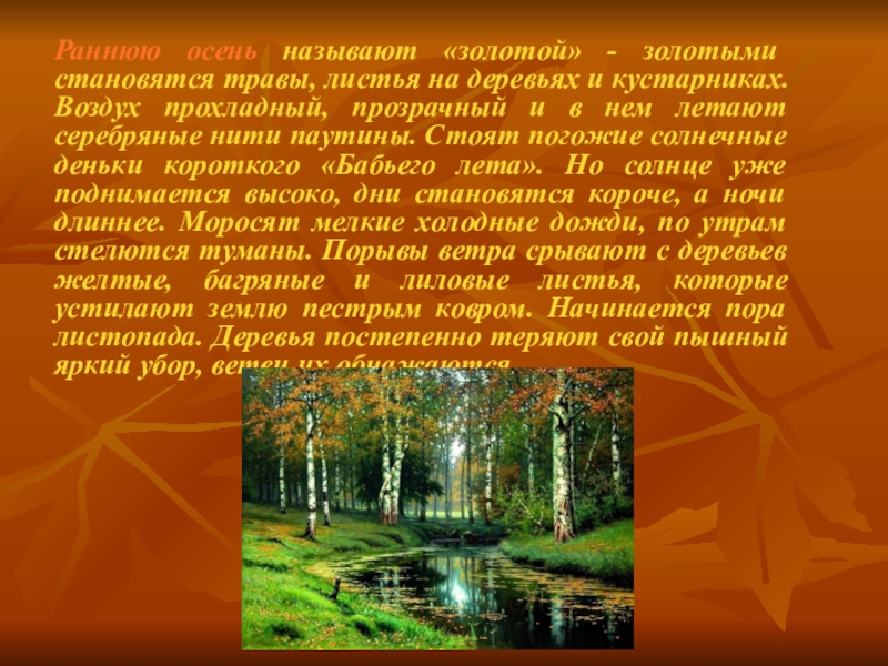Слайд 3Раннюю осень называют «золотой» - золотыми становятся травы, листья на деревьях