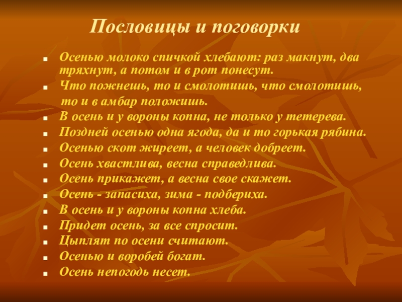 Об урожае с осени хлопочи, собрал урожай, а о новом надумывай. В сентябре шуба за кафтаном гоняется, а синица осень в гости просит.