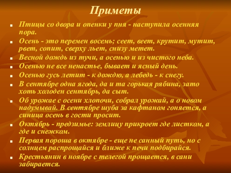 Осень - это перемен восемь; сеет, веет, крутит, мутит, рвет, сопит, сверху льет, снизу метет.