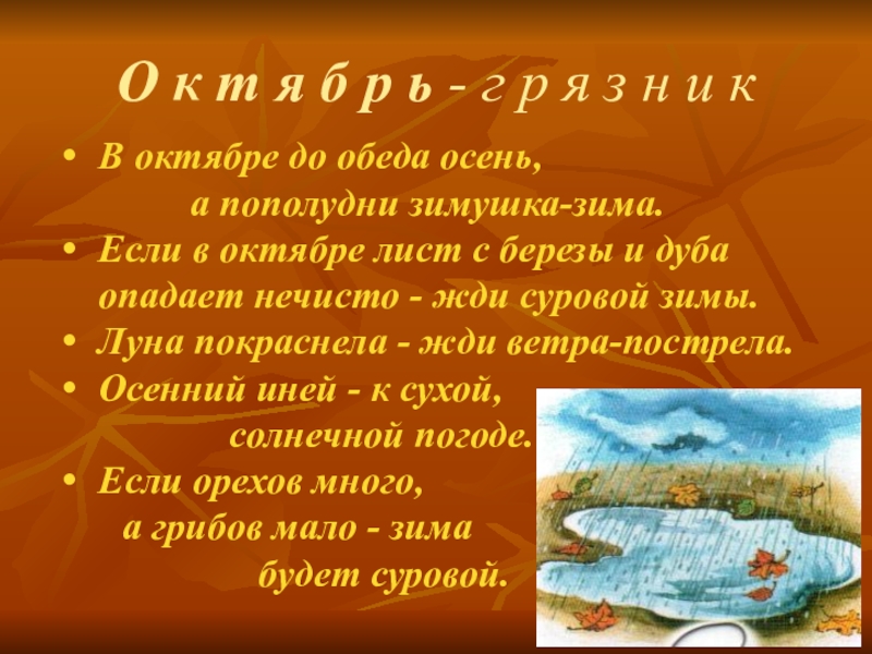 Если в октябре лист с березы и дуба опадает нечисто - жди суровой зимы.