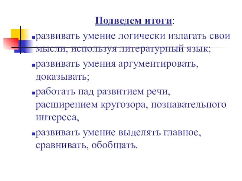развивать умение логически излагать свои мысли, используя литературный язык;