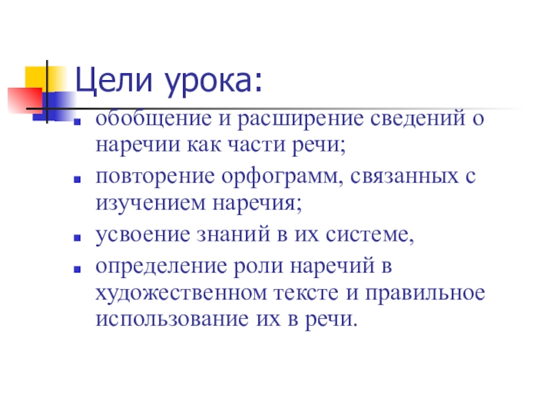 обобщение и расширение сведений о наречии как части речи;