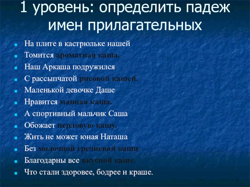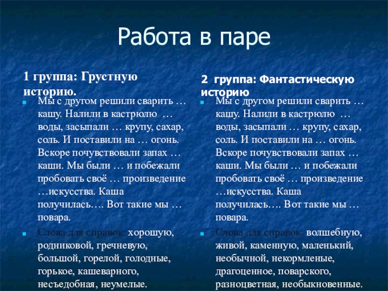 Мы с другом решили сварить … кашу. Налили в кастрюлю … воды, засыпали … крупу, сахар, соль. И поставили на … огонь. Вскоре почувствовали запах … каши. Мы были … и побежали пробовать своё … произведение …искусства. Каша получилась…. Вот такие мы … повара.