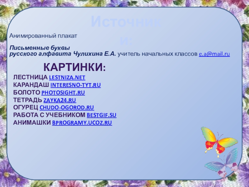 Слайд 17Анимированный плакат Письменные буквы русского алфавита Чулихина Е.А. учитель начальных классов e.a@mail.ru