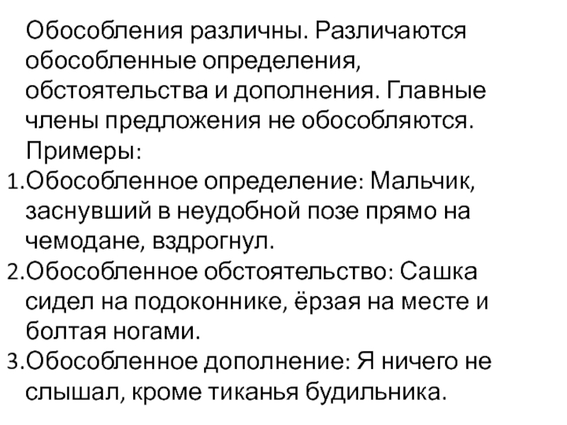 Слайд 4Обособления различны. Различаются обособленные определения, обстоятельства и дополнения. Главные члены предложения